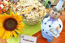 Kartoffelsalat „Sommer“ leicht und frisch mit sonnengereifter Paprika und Salatgurke, Kartoffelsalat „Klassisch“ mit Essig und Öl sowie optional mit Schinkenwürfeln, Tomatensalat, Nudelsalat „Sommer“ mit Mais und Paprika, Nudelsalat „klassisch“ mit Fleischwurst und Champignons in köstlichem Remouladendressing, Hirtensalat, Krautsalat, Gurkensalat. Unsere Salate sind alle Original Hausmannskost und werden noch mit viel Herz selbst zubereitet.